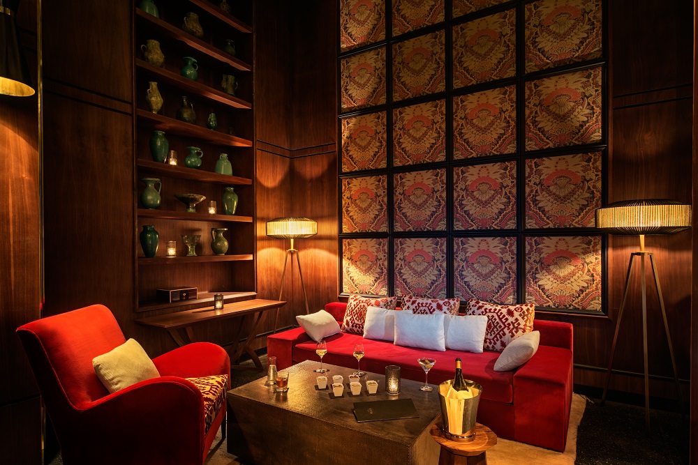 Cheminée et bar en laiton, espace bibliothèque, piano et ventilo rétro créent une ambiance musicale jazzy dans une atmosphère feutrée aux accents british.