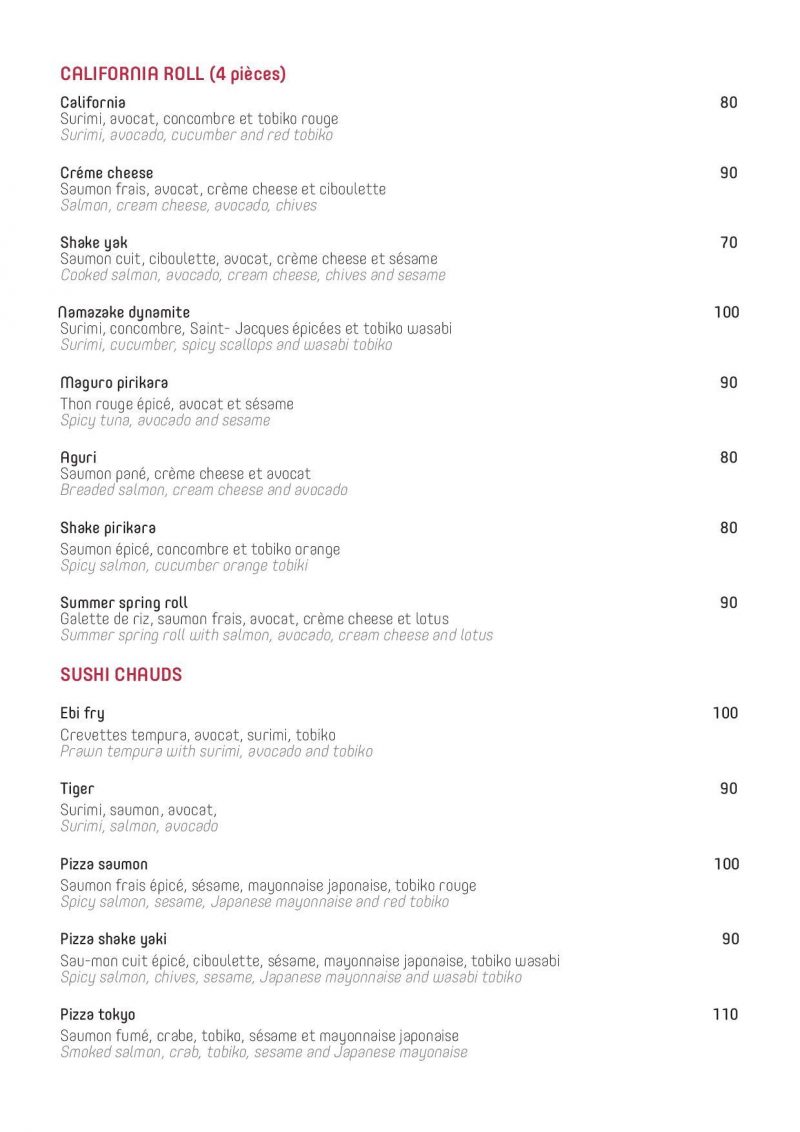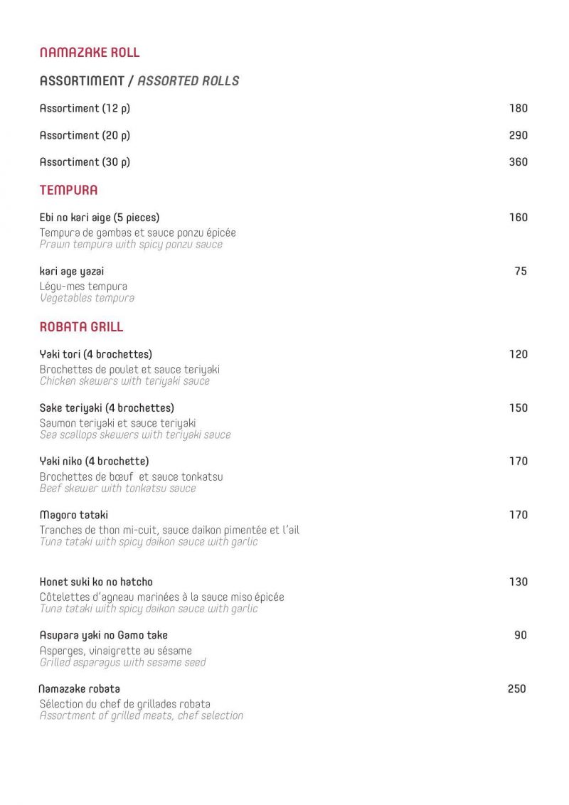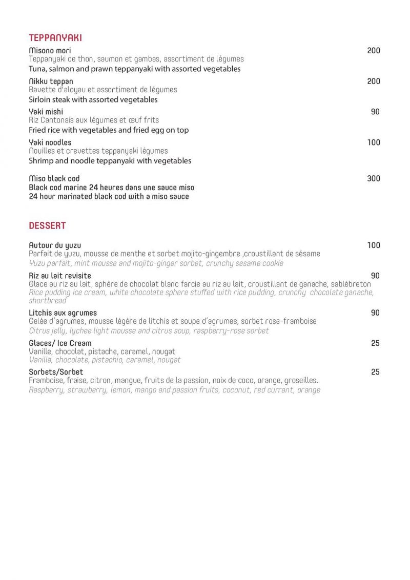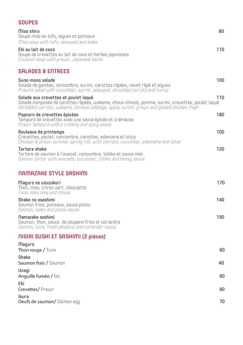 Tout en profitant de la plus belle vue de Marrakech, le Chef propose des plats signature et des salades préparées avec des produits locaux comme la Suno-Mono Salade faite avec des gambas, concombre, surimi, carottes et navets râpés et algues, ou alors les Summer spring roll : galettes de riz, saumon frais, avocat, crème cheese et lotus et finir avec un dessert frais : Autour du Yuzu , parfait de Yuzu, mousse de menthe et sorbet mojito-gingembre et croustillant de sésame.