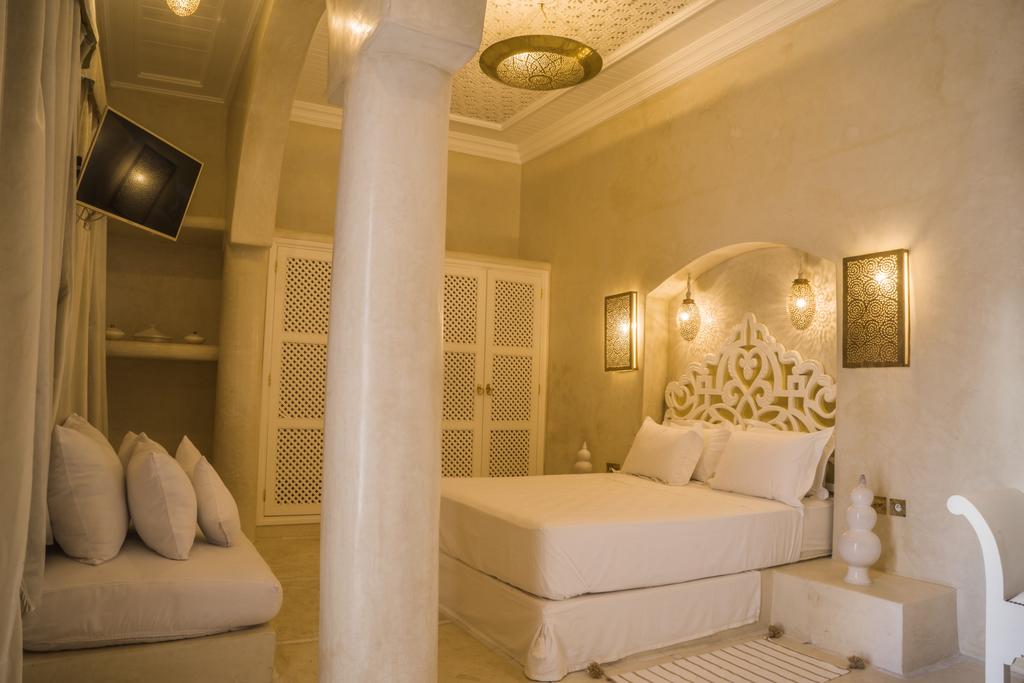 Lors d’un séjour à Marrakech, se loger dans le Riad Palais Blanc est une bonne idée. Après avoir parcouru à pied les différents sites touristiques se trouvant à proximité : musée Dar Si Saïd, la fameuse place Djema El Fna, les souks, le Palais de la Bahia, etc. l’hôtel constitue un véritable havre de paix. Les résidents seront bien isolés des tumultes de la ville dans l’enceinte de l’établissement. Ils peuvent profiter tranquillement de leur véranda ou de la piscine à débordement pendant les heures les plus chaudes de la journée.La décoration du riad, que ce soit les chambres ou les parties communes, est un véritable clin d’œil à la culture marocaine. Mais l’ajout d’une touche italienne a permis d’apporter plus d’élégance et de raffinement à l’ensemble. Les chambres et les suites sont non seulement spacieuses, allant de 30 à 45 mètres carrés, mais surtout bien équipées : climatisation/chauffage, coffre-fort, TV satellite, literie XXL, sèche-cheveux, etc. Les clients ont accès à la connexion Wi-Fi dans l’enceinte de l’établissement.